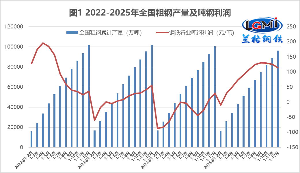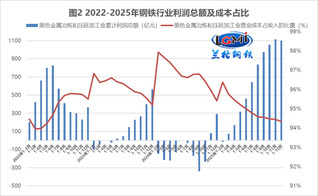 據(jù)國(guó)家統(tǒng)計(jì)局?jǐn)?shù)據(jù)顯示,2025年1-12月份,黑色金屬冶煉和壓延加工業(yè)實(shí)現(xiàn)營(yíng)業(yè)收入77268.3億元,同比下降4.7%;營(yíng)業(yè)成本72899.0億元,同比下降5.7%;利潤(rùn)總額1098.3億元,同比增長(zhǎng)299.2%。蘭格點(diǎn)評(píng)