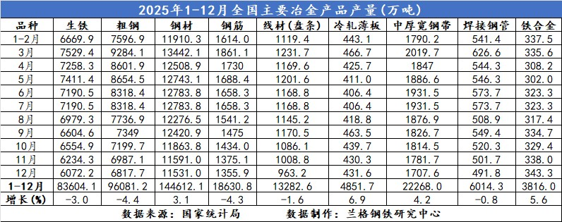 表1 2025年1-12月全國(guó)主要冶金產(chǎn)品產(chǎn)量