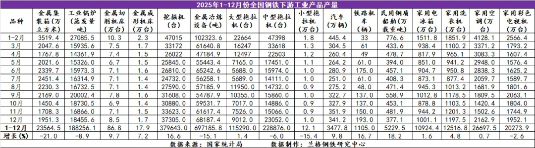 表2 2025年1-12月全國(guó)鋼鐵下游工業(yè)產(chǎn)品產(chǎn)量