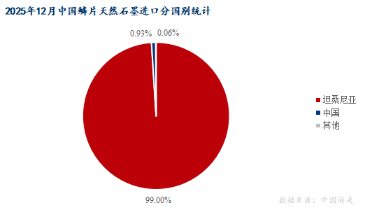2025年12月天然鱗片石墨進口的2608.911噸,從坦桑尼亞進口量最大,占比為99.00%,從中國進口量占比為0.93%,其他貿(mào)易伙伴進口總量為0.06噸,總占比不足1%。