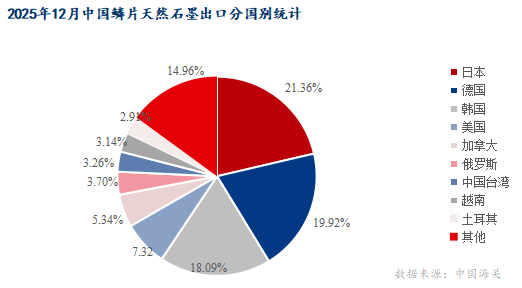 2025年12月天然鱗片石墨出口6867.889噸,其中日本出口量最大為1466.725噸,占總比重的21.36%,其次是德國出口量為1368.003噸,占總比重的19.92%,其他貿(mào)易伙伴出口量總共占比為14.96%。