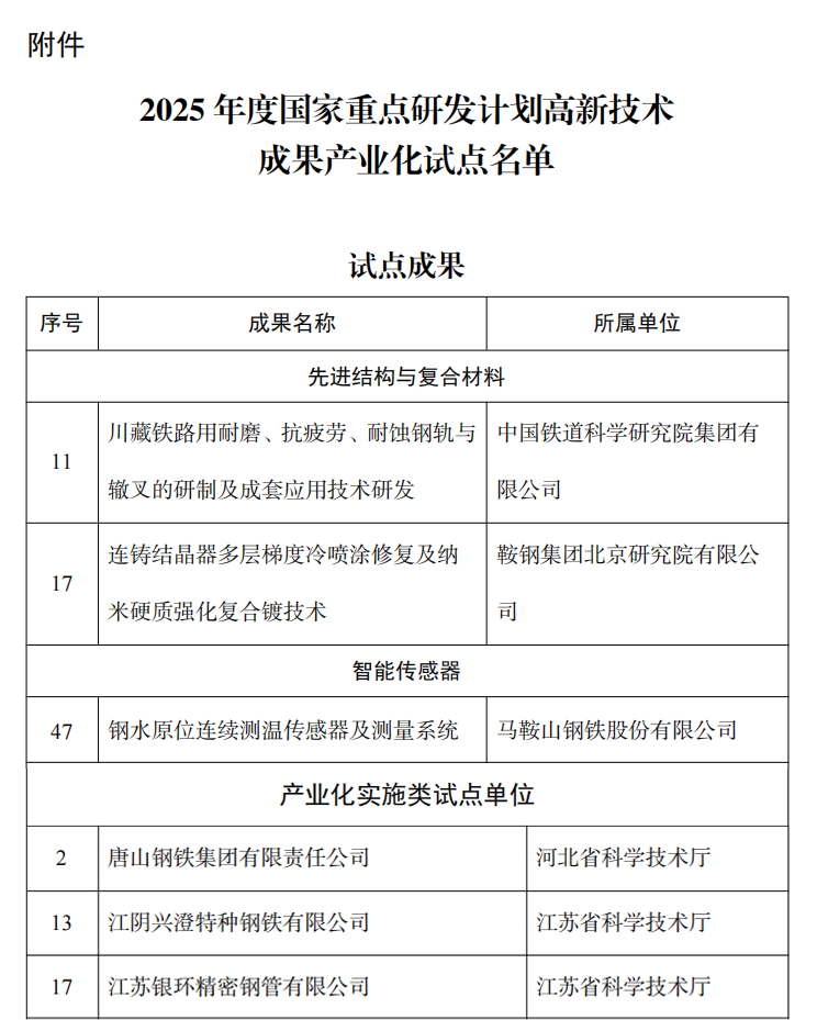 該名單涉及多個(gè)鋼鐵相關(guān)成果與單位,具體如下: