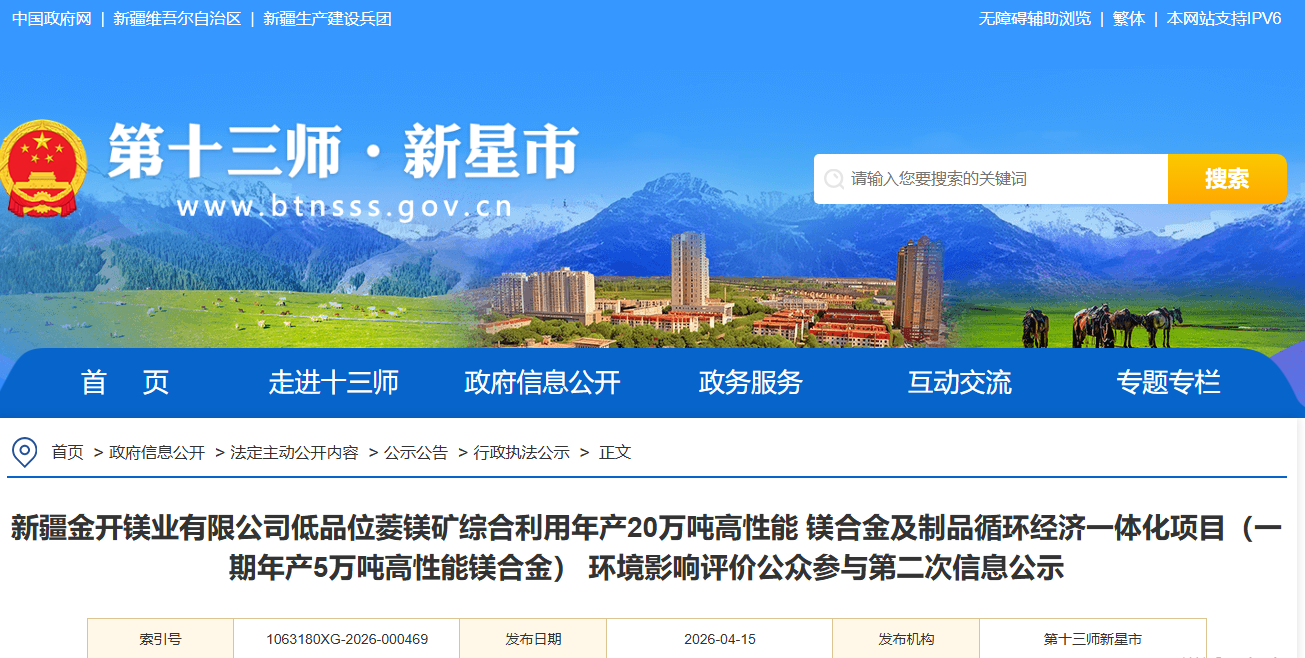 我公司委托新疆辰光啟航環(huán)保技術(shù)有限公司承擔(dān)了“新疆金開鎂業(yè)有限公司低品位菱鎂礦綜合利用年產(chǎn)20萬噸高性能鎂合金及制品循環(huán)經(jīng)濟(jì)一體化項(xiàng)目(一期年產(chǎn)5萬噸高性能鎂合金)”的環(huán)境影響評價(jià)工作?,F(xiàn)環(huán)境影響評價(jià)單位編制完成了《新疆金開鎂業(yè)有限公司低品位菱鎂礦綜合利用年產(chǎn)20萬噸高性能鎂合金及制品循環(huán)經(jīng)濟(jì)一體化項(xiàng)目(一期年產(chǎn)5萬噸高性能鎂合金)環(huán)境影響報(bào)告書》(征求意見稿),根據(jù)《中華人民共和國環(huán)境影響評價(jià)法》《環(huán)境影響評價(jià)公眾參與辦法》(生態(tài)環(huán)境部令第4號)等法律法規(guī)及相關(guān)規(guī)定,現(xiàn)對該項(xiàng)目進(jìn)行公眾參與第二次信息公開,請社會公眾對該報(bào)告提出意見和建議。公示材料如下: