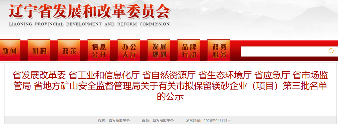 根據(jù)《遼寧省人民政府辦公廳關(guān)于推進(jìn)菱鎂行業(yè)高質(zhì)量發(fā)展的實(shí)施意見(jiàn)》(遼政辦發(fā)〔2023〕15號(hào))、《遼寧省人民政府辦公廳關(guān)于印發(fā)遼寧省菱鎂行業(yè)專項(xiàng)整治方案的通知》(遼政辦發(fā)〔2023〕34號(hào))要求,有關(guān)市政府向省菱鎂行業(yè)高質(zhì)量發(fā)展領(lǐng)導(dǎo)小組辦公室報(bào)送了本市擬保留鎂砂企業(yè)(項(xiàng)目)名單,同時(shí)對(duì)部分已公示項(xiàng)目進(jìn)行了調(diào)整?,F(xiàn)將相關(guān)企業(yè)(項(xiàng)目)名單有關(guān)情況面向社會(huì)公示,公示期5個(gè)工作日。
